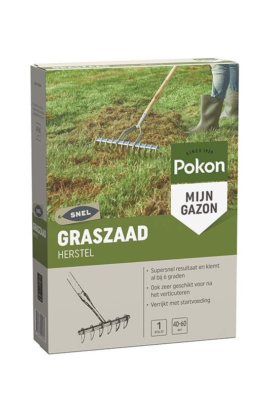 Pokon Graszaad Herstel is geschikt voor het herstel van je gazon, zowel van kale plekken als na het verticuteren. Met dit speciale SOS-graszaad wordt je gazon weer supersnel egaal groen. Het graszaad kiemt al na 1 week, zelfs bij een bodemtemperatuur van 6 graden Celsius. Pokon Graszaad Herstel is ideaal als snelle oplossing, ook in de herfst- en wintermaanden. Voor een optimale ontkieming is het van belang dat de grond niet te koud is (+6 graden Celsius) en dat de buitentemperatuur hoger is dan 15 graden Celsius (max 25 graden Celsius). Zaai in een vochtige grond en bij windstil weer. Wanneer er geen regen is gevallen, besproei dan eerst de grond. Zaai het graszaad gelijkmatig en niet te dicht op elkaar, dit belemmert de ontwikkeling. Kiemduur is 1 tot 2 weken, afhankelijk van lucht- en bodemtemperatuur en hoeveelheid vocht. Zorg ervoor dat de grond na het zaaien de eerste 2 tot 4 weken vochtig blijft door voorzichtig en gelijkmatig te sproeien. Droogt de bovenlaag uit, dan mislukt de kieming of sterven de kleine grasplantjes af.