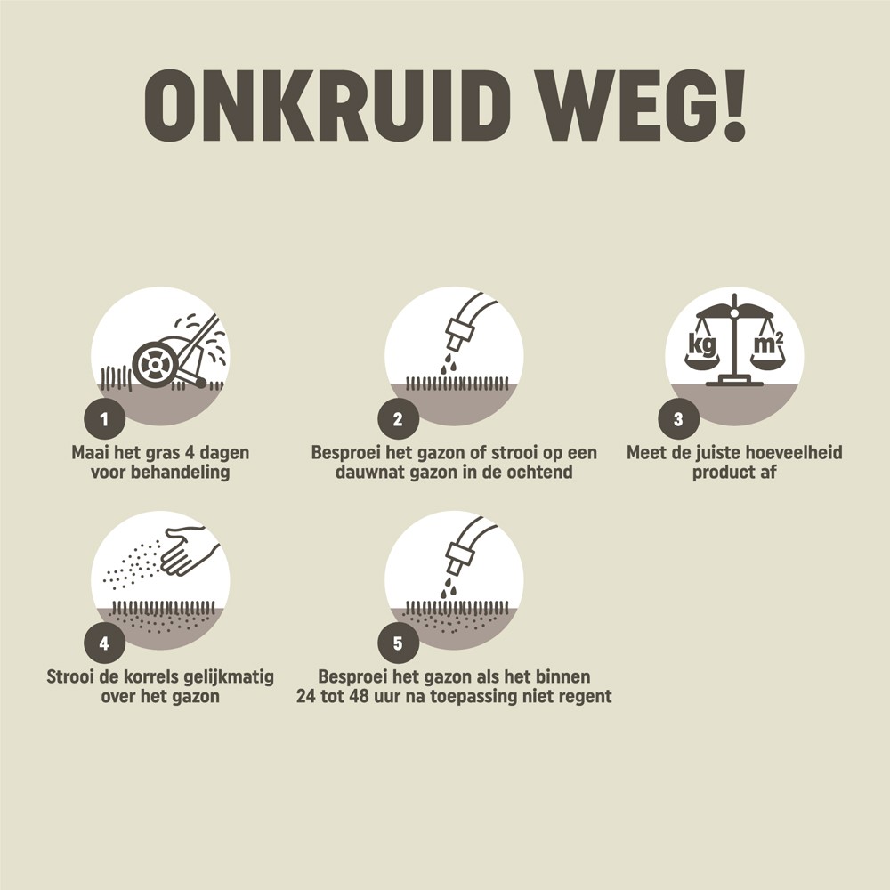 Last van onkruid in je gazon? Pokon Onkruid Weg! is een effectieve manier om dit probleem op te lossen. Met deze onkruidbestrijder, die bovendien gazonmest bevat, wordt onkruid verwijderd en je gazon direct gevoed. De gazonmest bevat essentiële voedingsstoffen die ervoor zorgen dat je gazon beter bestand is tegen onkruid. Onkruid kun je het beste behandelen in de periode maart t/m september. Voor een optimale behandeling is het belangrijk dat de grond niet is bevroren, dat er geen zware regen wordt verwacht en dat de buitentemperatuur niet te hoog is (het gras kan verbranden). Maai het gazon de eerste 4 dagen na toepassing niet. Na het behandelen van onkruid kunnen er kale plekken ontstaan. Met Pokon Kale Plekken Hersteller heb je snel weer een egaal, groen gazon.